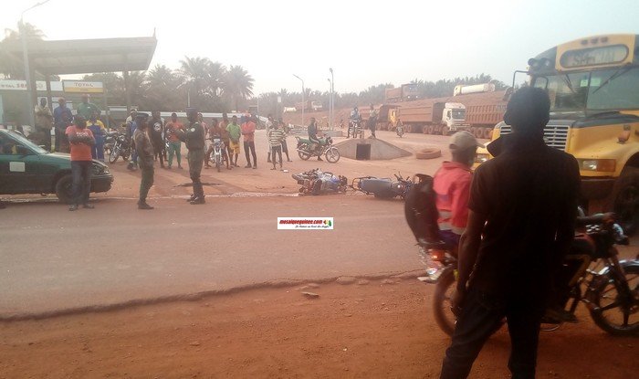 Il s’agit de deux motos qui sont entrées en collision avec un véhicule Peugeot de couleur verte aux environs de 18 heures sur la route Kolaboui-Boké non loin du pont de franchissement de cette route minière.