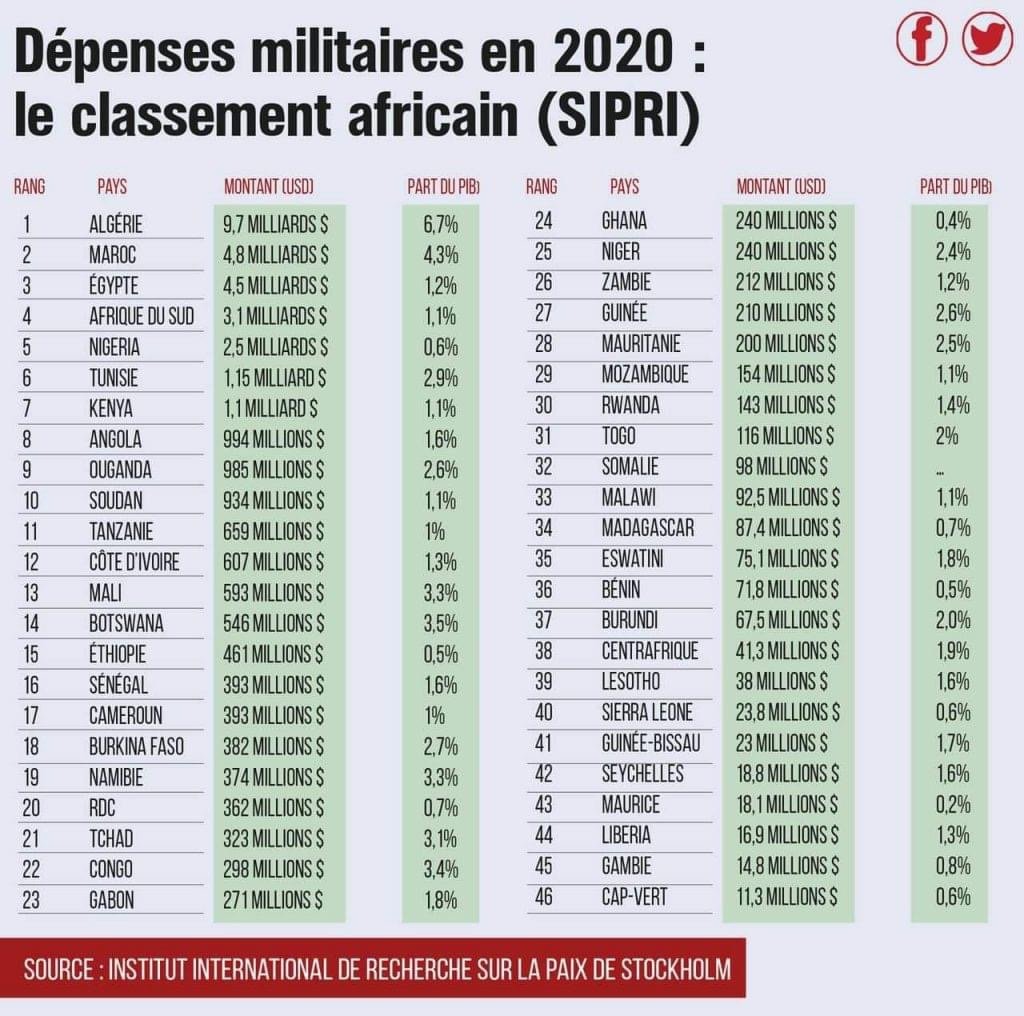 Voici le classement de l’institut international de recherche sur la paix de Sotckholm: