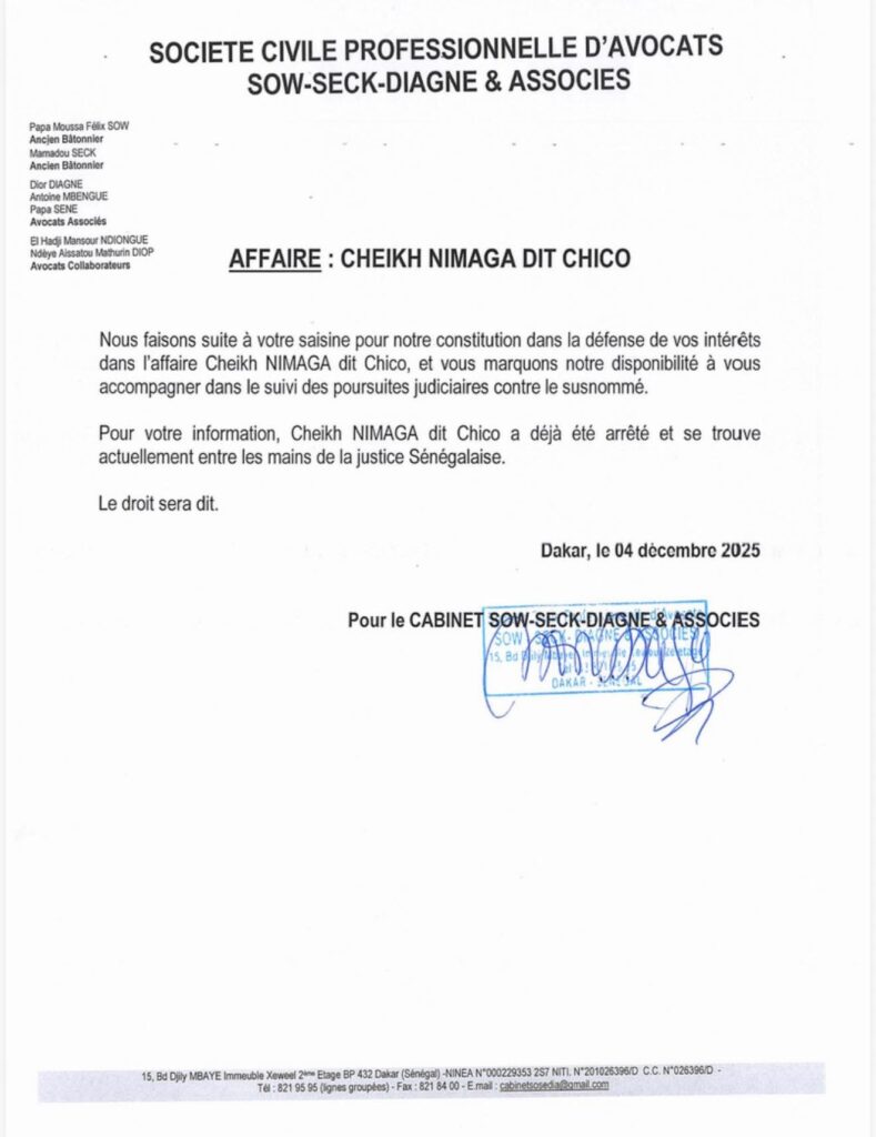 Selon le document transmis par le cabinet, les avocats confirment leur constitution dans ce dossier ainsi que leur disponibilité à accompagner la partie plaignante dans le suivi des poursuites judiciaires engagées contre l’intéressé. Le cabinet informe également que Cheikh Nimaga alias Chico a été arrêté et se trouve actuellement entre les mains de la justice sénégalaise, où la procédure suit son cours.