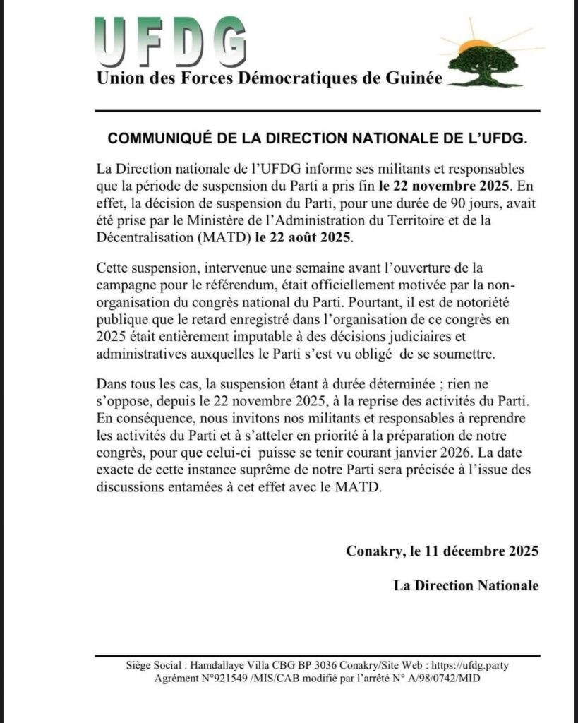 La Direction nationale de l’Union des Forces Démocratiques de Guinée (UFDG) a annoncé, ce 11 décembre 2025, la fin de la période de suspension du parti, intervenue le 22 novembre 2025. Cette suspension de 90 jours avait été prononcée le 22 août 2025 par le Ministère de l’Administration du Territoire et de la Décentralisation (MATD).