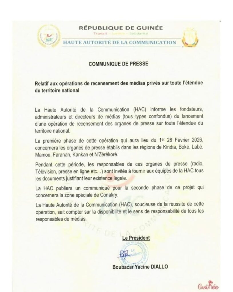 La première phase de cette opération se déroulera du 1er au 28 février 2026. Elle ciblera les organes de presse établis dans les régions administratives de Kindia, Boké, Labé, Mamou, Faranah, Kankan et N’Zérékoré. Durant cette période, les responsables des médias concernés sont invités à fournir aux équipes de la HAC l’ensemble des documents attestant de l’existence légale de leurs structures.